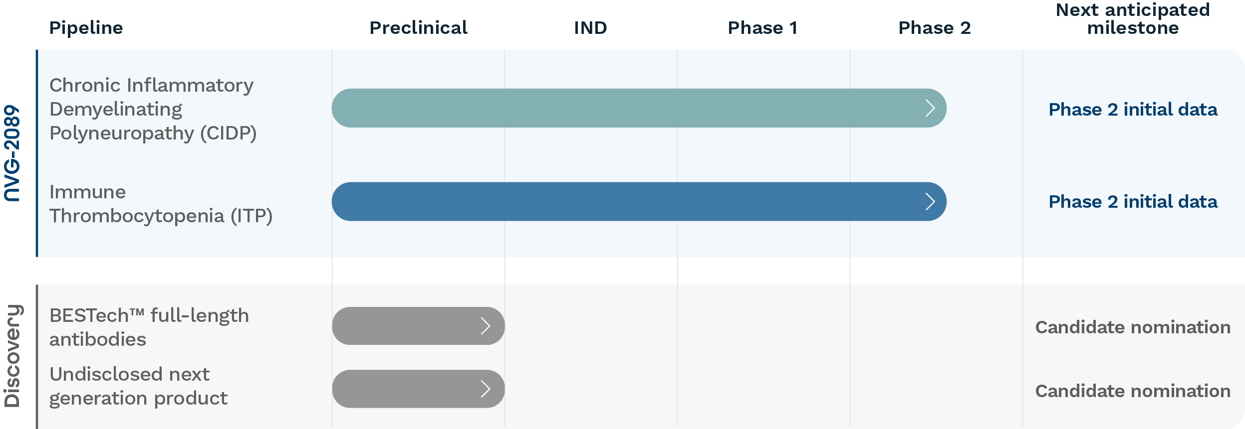 We aim to bring safe, efficacious immune-modulating therapies to patients with autoimmune disease. We are developing NVG-2089 to treat patients with unmet and severe neurologic and dermatologic autoimmune disease. Our next-generation BESTech™ platform promises to enhance the function of multiple clinically validated drug targets, improving existing treatment across a wide range of autoimmune diseases.